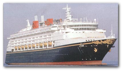 Although no-one has yet experienced Disney Magic's on-board ambience, every ocean liner enthusiast is at liberty to judge how well the Disney people have achieved their ocean liner look. The end result is boldly unconventional, with a long, length of black hull--the first since QE2 of 1969--adorned at either end with painted, decorative scrollwork. A series of glass-topped appendages ranged high above the water seem to ape the ancient placement of lifboats, even though there is a perfectly good collection of boats further down nearer the water. Superstructure just behind the twin funnels swells into an unfortunate camel's hump; however, it was to be expected that Disney's 1990's tween-deck logistical requirements far exceed those, for instance, that Cunard permitted Arthur Davis back in 1912 aboard Aquitania.