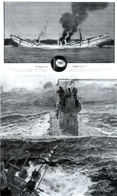 nearby, as though posing at a naval review! She is vulnerably on the surface in plain sight, too close to be in ambush and one wonders at the rationale behind the artist’s mis-en-scene. Might it be a British submarine?
